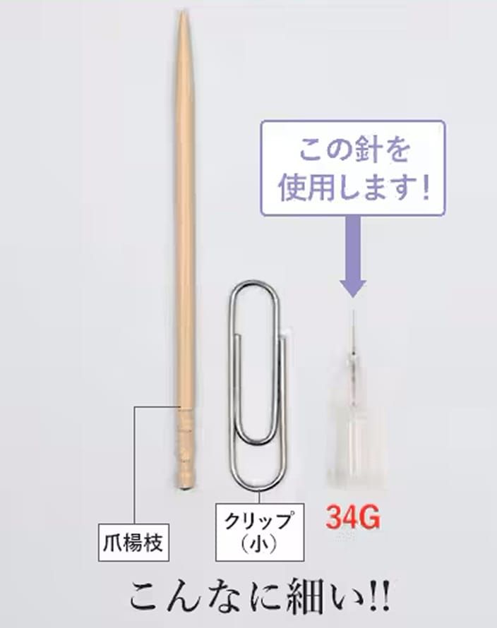 34G(ゲージ)と呼ばれる、髪の毛2本分くらいの細さの針で注入するため、注入時の一瞬のチクッとした感覚も、採血のなどの痛みとは大きく異なります。