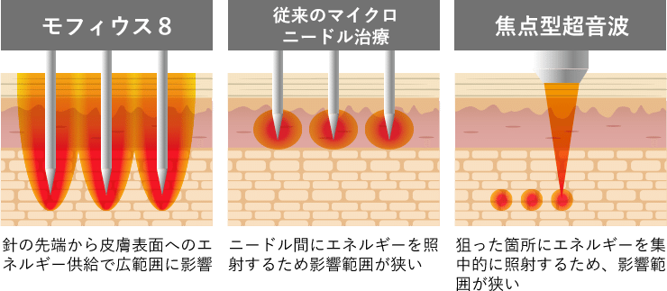 よって、皮膚構造の深部~皮膚表面にかけての広範囲で熱をくわえられるモフィウス8は、強力なタイトニングとともに肌質改善も実現する治療なのです。
