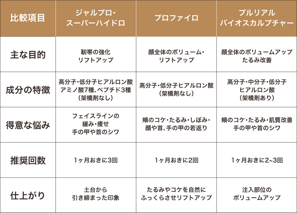 ジャルプロ・スーパーハイドロは、高分子ヒアルロン酸と低分子ヒアルロン酸と7種のアミノ酸と3種のペプチドで顔の靭帯(リガメント)を再生・強化する肌育注射です。
