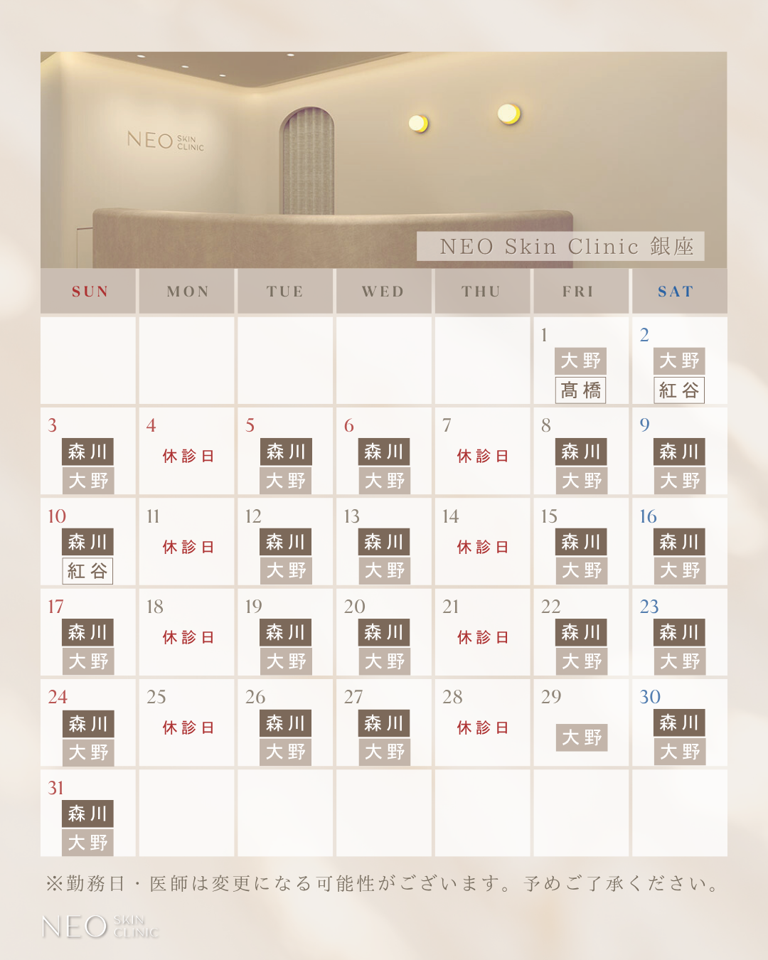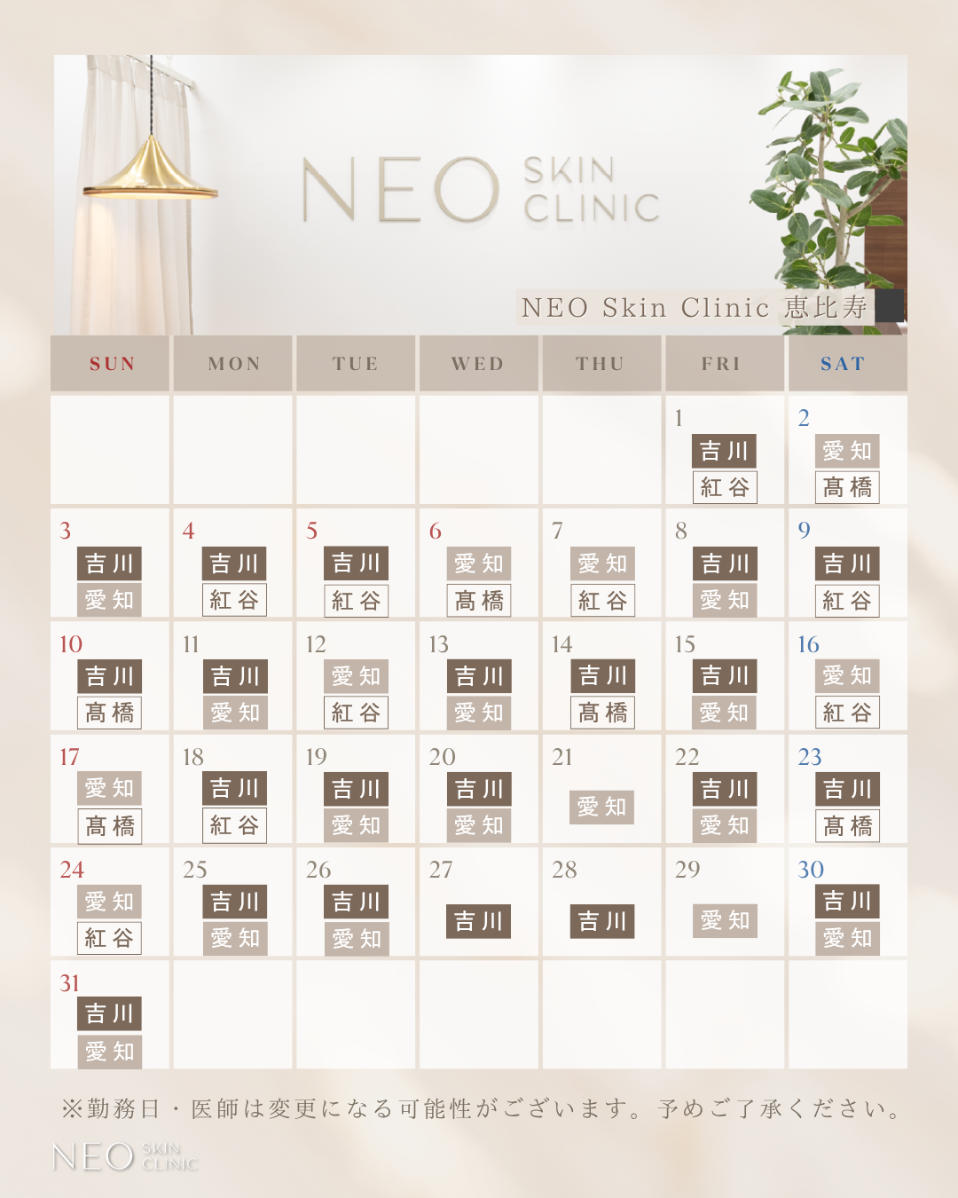 いつもNEO Skin Clinicをご利用いただきありがとうございます。2026年5月の恵比寿院・銀座院の医師出勤カレンダーをお知らせいたします。カウセリングや施術をご検討中の方は、ぜひ参考にしてください。